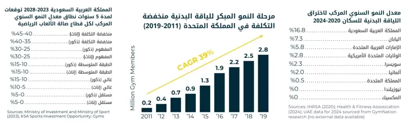 تشير البيانات الأخيرة إلى أن الشرق الأوسط في مرحلة النمو المبكر لقطاع اللياقة البدنية منخفض التكلفة وعالي القيمة على غرار تجربة المملكة المتحدة في 2011. في بريطانيا، نمت الصالات الرياضية منخفضة التكلفة بمعدل نمو سنوي مركب بلغ 39% على مدار ثمانية أعوام، بينما شهد نمو الصالات الخاصة التقليدية حالة من الركود. في الشرق الأوسط، توقعت وزارة الاستثمار ووزارة الرياضة (2023) أن يتراوح معدل النمو السنوي المركب من 35 إلى 40% لعضويات الرجال منخفضة التكلفة، ومن 40 إلى 45% لعضويات النساء خلال السنوات الخمس المقبلة في المملكة العربية السعودية.