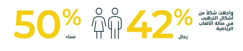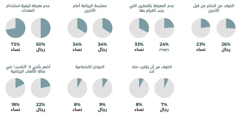 على الرغم من زيادة الإقبال على اللياقة البدنية، إلا أن العديد من الأعضاء المحتملين في الصالات الرياضية يتراجعون بسبب الشعور بالرهبة حيث أفاد حوالي 50% من النساء و42% من الرجال في المملكة العربية السعودية والإمارات بأنهم يشعرون بالتوتر في الصالة الرياضية؛ في حين أشار 72% من النساء و 50% من الرجال إلى أنهم لا يعرفون كيفية استخدام المعدات. كما أن هناك شكوكاً واسعة حول التمارين الصحيحة التي يجب أداؤها. تبرز هذه البيانات فرصة مهمة لخلق بيئات داعمة تخفف من هذه المخاوف، خاصةً بين الأعضاء الجدد في الصالات الرياضية.