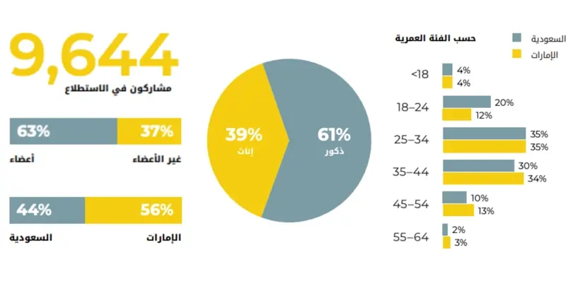 كان هدفنا هو الوصول إلى أكبر عدد ممكن من الأشخاص من خلال استبياننا، مما يضمن جمعنا لمجموعة واسعة من وجهات النظر لأفضل تمثيل ممكن للسكان. نحن ندرك أن عيّنتنا قد لا تعكس بشكل كامل إجمالي عدد السكان، وذلك بصفتنا مشغلاً عالي القيمة ومنخفض التكلفة. وللتخفيف من هذه المشكلة، سعينا إلى الحصول على حجم استجابة كبير (ن = 9,644)، يشمل كلاً من الأعضاء (63%) وغير الأعضاء (%۳۷) من دولتين. من بين المشاركين، 44% من المملكة العربية السعودية و56% من الإمارات العربية المتحدة، مع توزيع الجنسين 39% من الإناث و61% من الذكور.