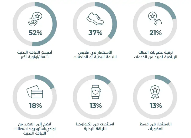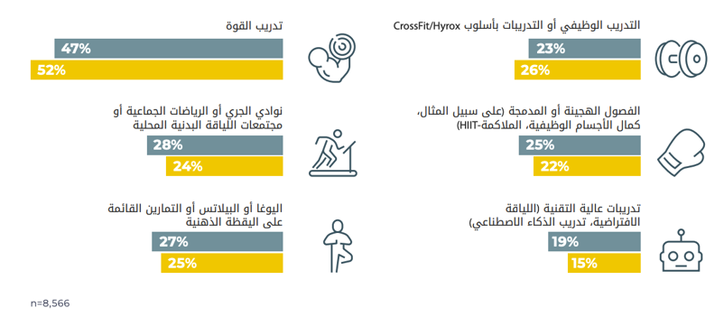 - أما التمارين عالية التقنية القائمة على الذكاء الاصطناعي واللياقة البدنية الافتراضية) فهي على نسبة %19 من المملكة العربية السعودية و 15% من الإمارات العربية المتحدة، مما يشير إلى اهتمام متزايد بالحلول الرقمية.