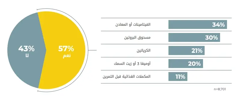 أجاب %57 ً من المشاركين أنهم يستخدمون نوعا من المكملات الغذائية. احتلت الفيتامينات المتعددة المرتبة الأولى بنسبة %34 من الأشخاص الذين يستخدمونها. وجاء في المرتبة الثانية مشروبات البروتين، حيث أفاد %30 من المستخدمين أنهم يستخدمون مشروبات البروتين. ومن المثير للاهتمام أن %20 أفادوا باستخدام مكملات الكرياتين والأوميغا 3 ما قد يشير إلى تركيز أكبر على الأداء أو تحسين الصحة من خلال التغذية.