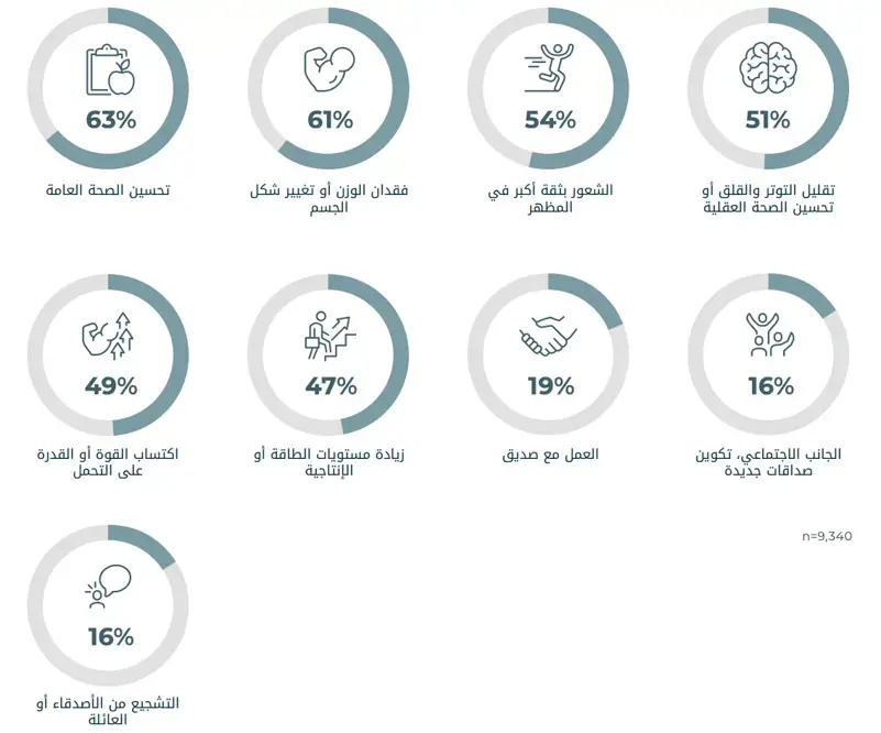 تحسين الصحة هو الدافع الأول، يليه أهداف تكوين الجسم بنسبة 63% و61% على التوالي. ويتماشى ذلك مع بحثنا السابق حيث أشار 92% من المشاركين إلى رغبتهم في تحسين صحتهم، وهو مؤشر رائع على جهود المنطقة في دعم صحة ولياقة شعوبها. في المرتبة الثالثة يأتي الشعور بالثقة بالنفس من خلال المظهر بنسبة 54%، وفي المرتبة الرابعة يأتي تخفيف التوتر وتحسين الصحة النفسية بنسبة 51%، تليها رغبة 49% في زيادة القوة أو تحسين التحمل. ومن المثير للاهتمام أن التمرين مع الأصدقاء أو الجوانب الاجتماعية لا تبدو محفزات قوية، حيث أن 19% فقط من الأشخاص يقولون إن التمرين مع صديق يحفزهم على ممارسة الرياضة.