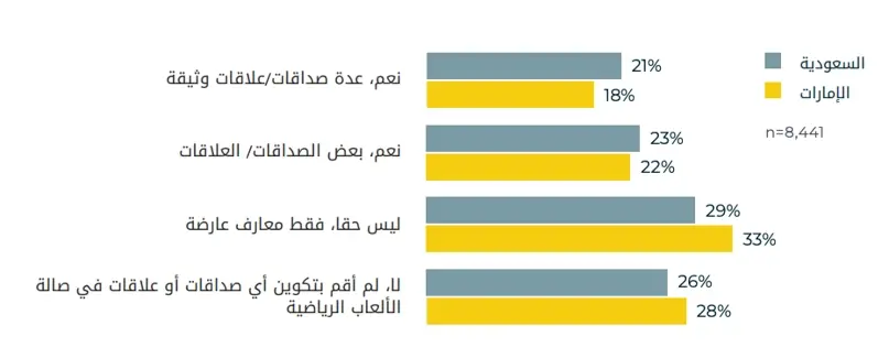 الصالة الرياضية هي مكان للتواصل الاجتماعي: ما يقرب من نصف رواد الصالة الرياضية في المملكة العربية السعودية والإمارات العربية المتحدة كوّنوا علاقات ذات معنى أثناء ممارسة التمارين الرياضية.