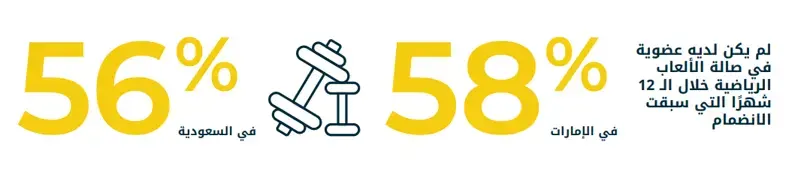 عند سؤالهم عن تجاربهم السابقة في الصالات الرياضية، أفاد 56% من الأعضاء الجدد في السعودية و58% في الإمارات أنهم لم يكن لديهم اشتراك في صالة رياضية خلال الـ12 شهراً التي سبقت انضمامهم. هذا يعني أن نسبة كبيرة من الأعضاء هم جدد تماماً على عالم الصالات الرياضية. ويسلط ذلك الضوء على إمكانات السوق لتوسيع فرص الصحة واللياقة البدنية في هذه البلدان، حيث يستمر ازدياد الوعي والرغبة في تبنّي نمط حياة صحي.