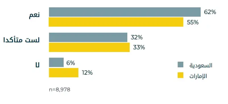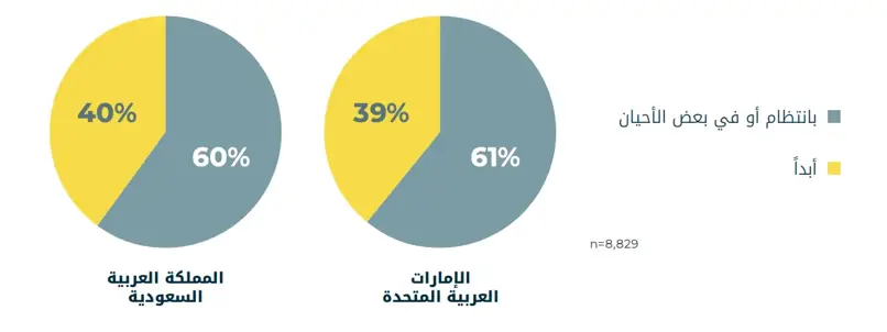 ■ 40% في المملكة العربية السعودية و39% في الإمارات العربية المتحدة يقولون إنهم لا يستخدمون الأجهزة القابلة للارتداء مطلقاً. يشير هذا إلى أنه على الرغم من أن الأجهزة القابلة للارتداء أصبحت اتجاهاً سائداً، إلا أن الكثيرين لا يزالون يفضلون أساليب أبسط أو أكثر تقليدية للتتبع أو لا يتتبعون على الإطلاق.
