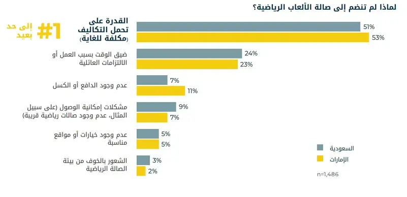 - التكلفة هي العائق الأكبر بالنسبة لغير الأعضاء: 51% في المملكة العربية السعودية و53% في الإمارات العربية المتحدة يعتقدون أن عضوية الصالات الرياضية باهظة الثمن.