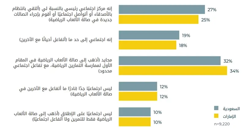 - يرى ما يقرب من نصفهم تقريباً أن الصالة الرياضية جزء من حياتهم الاجتماعية، حيث يقيم