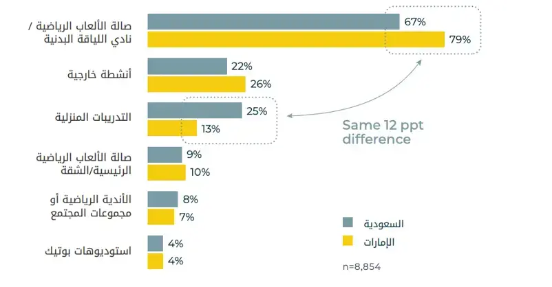 تُظهر دولة الإمارات العربية المتحدة تفضيلاً أكبر لعضوية الصالات الرياضية (بحوالي 12 نقطة مئوية، مما يؤكد على البنية التحتية القوية للياقة البدنية في البلاد والقدرة على تحمل تكاليف العضوية على نطاق واسع.