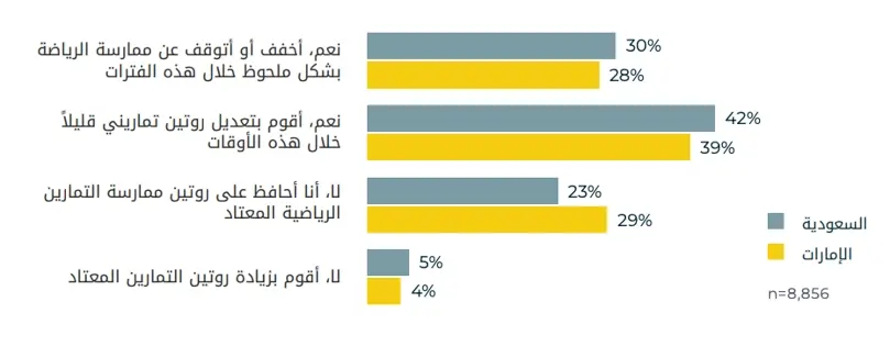 يمكن للفترات الثقافية والدينية أن تؤثر بشكل كبير على جداول المواعيد، وغالباً ما تكون ممارسة التمارين الرياضية من بين العادات الأولى التي يتم تعديلها. عند سؤالهم عن كيفية تأثير الأعياد مثل شهر رمضان أو الكريسماس على زياراتهم للنادي الرياضي، قال 30% من الأشخاص في المملكة العربية السعودية أنهم "يقللون أو يتوقفون عن ممارسة الرياضة بشكل كبير، مقارنة بـ %28 في الإمارات العربية المتحدة. ومع ذلك، فإن هذه الانقطاعات ليست عالمية - 42% في المملكة العربية السعودية و 39% في الإمارات العربية المتحدة "يعدلون” فقط “قليلاً“ من روتينهم الرياضي، بينما يتمكن حوالي الربع (%23 في المملكة العربية السعودية و29% في الإمارات العربية المتحدة من الحفاظ على عاداتهم الروتينية ثابتة. ومن المثير للاهتمام أن 5% في المملكة العربية السعودية و %4 في الإمارات العربية المتحدة يزيدون من تمارينهم خلال هذه الأوقات، وغالباً ما يشيرون إلى جداول زمنية أكثر مرونة ورغبة في الحفاظ على (أو تسريع) تقدمهم.