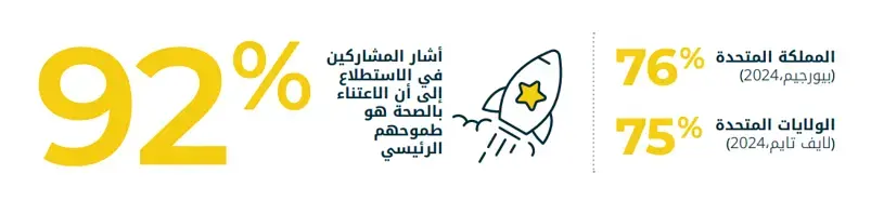 - 92% من المجيبين في المملكة العربية السعودية والإمارات العربية المتحدة يطمحون إلى تحسين صحتهم، وهي نسبة أعلى بكثير من المملكة المتحدة (76%) والولايات المتحدة الأمريكية (75%).