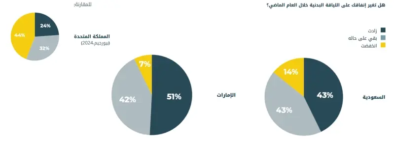 - أفاد أكثر من 43% من المشاركين في السعودية و 51% في الامارات بزيادة إنفاقهم على اللياقة البدنية في العام الماضي، مقارنة بـ24% فقط في المملكة المتحدة.